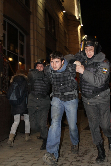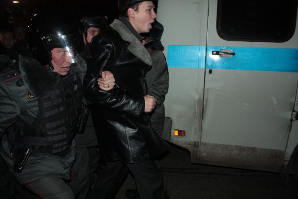 19:45 Избит также известный композитор Александр Маноцков. Задержан Сергей Митрохин. Рядом с входом в метро "Маяковская" взяли еще человек 30. В их числе две активистки "Другой России", которые пытались сжечь портрет Медведева, отобранный у "молодогвардейцев".