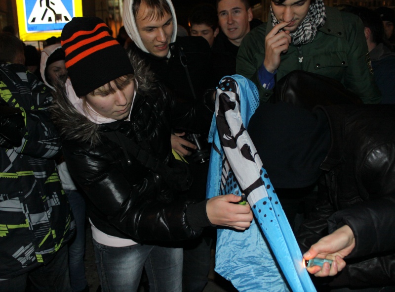 21:41 Полиция жалуется, что в них и прокремлевцев бросали бутылки националисты и "несогласные". А они, видимо, отвечали файерами.