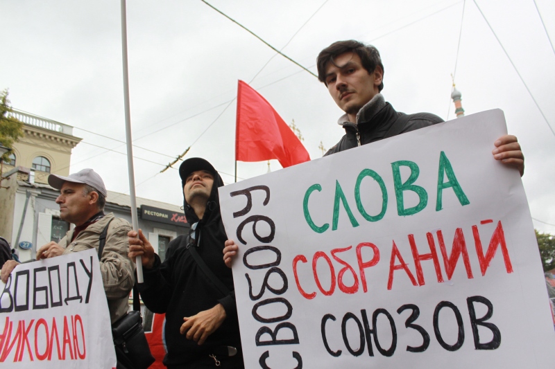 "Россия без буржуев", "Россия без Путина", "Россия для рабочих", а также требования освободить задержанных по делу о беспорядках 6 мая на Болотной.