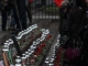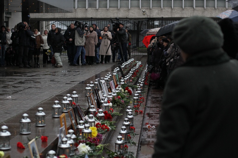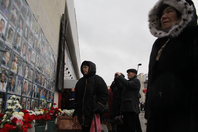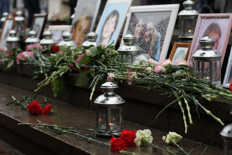 Почтить память погибших пришли около 200 человек, возле входа в центр размещены их фотографии, к ним люди кладут цветы и мягкие игрушки.