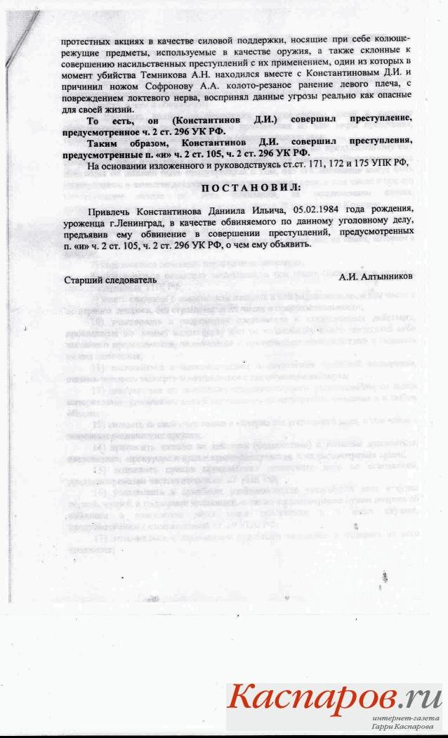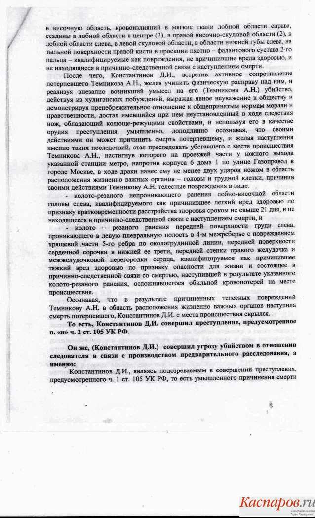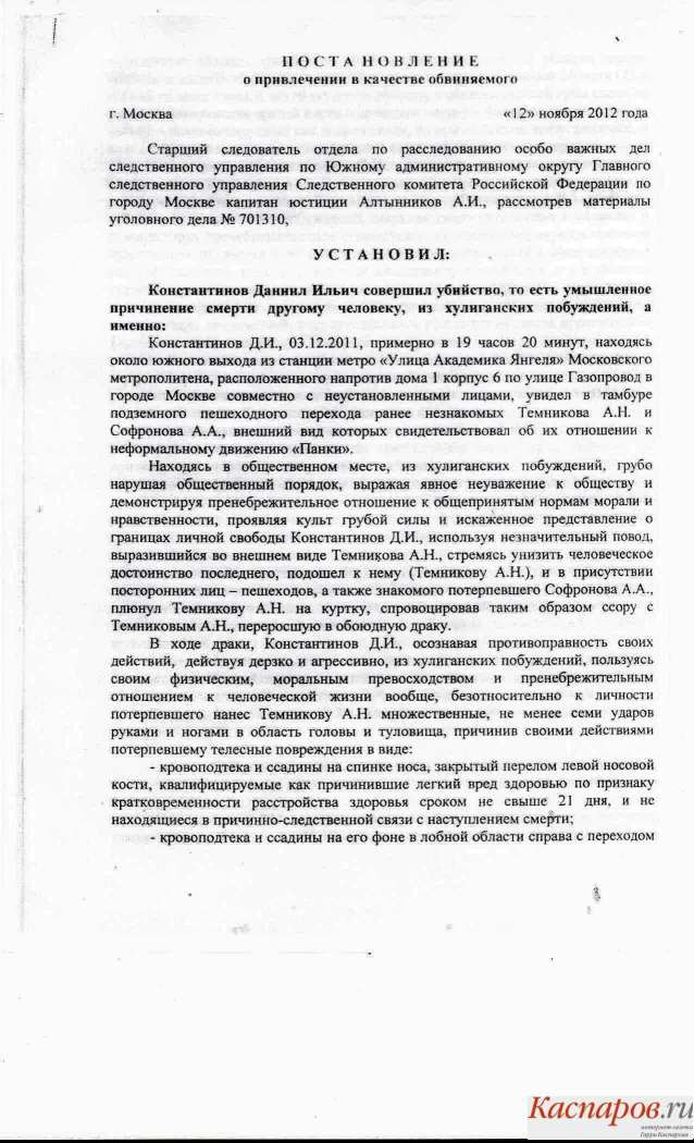 22 ноября адвокат Константинова Денис Зацепин обнародовал итоговое обвинение против своего подзащитного (копия документа прилагается). Подозрения в убийстве А. Темникова в переходе метро "Улица академика Янгеля" обросли новыми подробностями. Обвинение считает, что агрессию Константинова вызвал внешний вид прохожего, который напоминал панка. По версии следствия, Константинов спровоцировал драку с убитым —