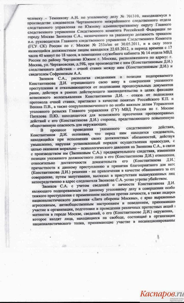 Коллеги Константинова по националистическому движению считают, что власти хотят запугать общество и склонить оппозиционных активистов к "осведомительству". "Несмотря на уверенность в невиновности Константинова и наличие "железного алиби" (по заявлениям защиты, в момент убийства он находился в другом конце Москвы — прим. Каспаров.Ru). Даниилу угрожает пожизненное заключение, — считает исполнительный директор фонда "РОД" Наталья Холмогорова. — В политических делах юридические меры уходят на второй план и помочь освобождению Даниила может широкий резонанс и широкая общественная поддержка".