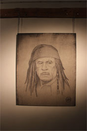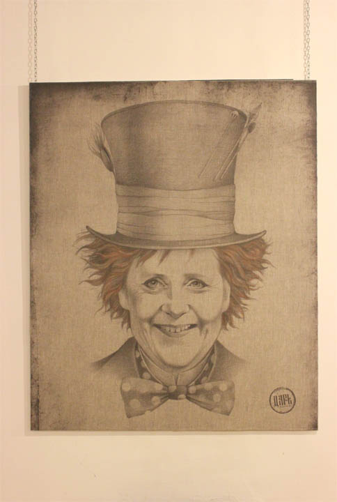 На выставке были представлены двадцать работ, выполненных в технике графики. На картинах изображены известные личности, начиная от Папы Римского в образе Джокера и заканчивая Муаммаром Каддафи в образе капитана Джека Воробья.