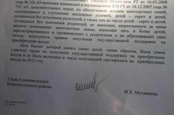 Также женщина поведала, что, согласно закону Республики Татарстан, местное Министерство строительства вправе менять очередность и произвольно формировать списки очередников на жилье. Когда она обратилась в министерство с претензией, чиновники только отмахнулись и сказали: "Все вопросы к исполкому (аналог мэрии в Набережных Челнах — прим. Каспаров.Ru)".