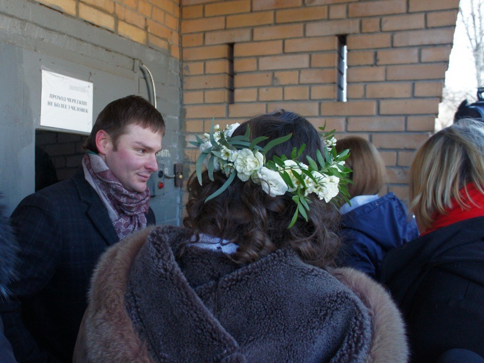 Остальные активисты и группа поддержки остались у ограждений. Встречать невесту вышел адвокат Ковязина Руслан Чанидзе, с ним вместе прошли свидетели, а также мамы Жени и Леонида.