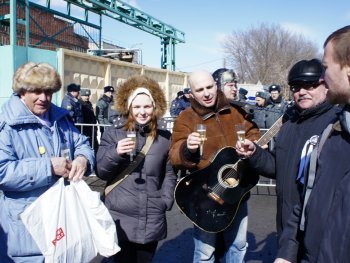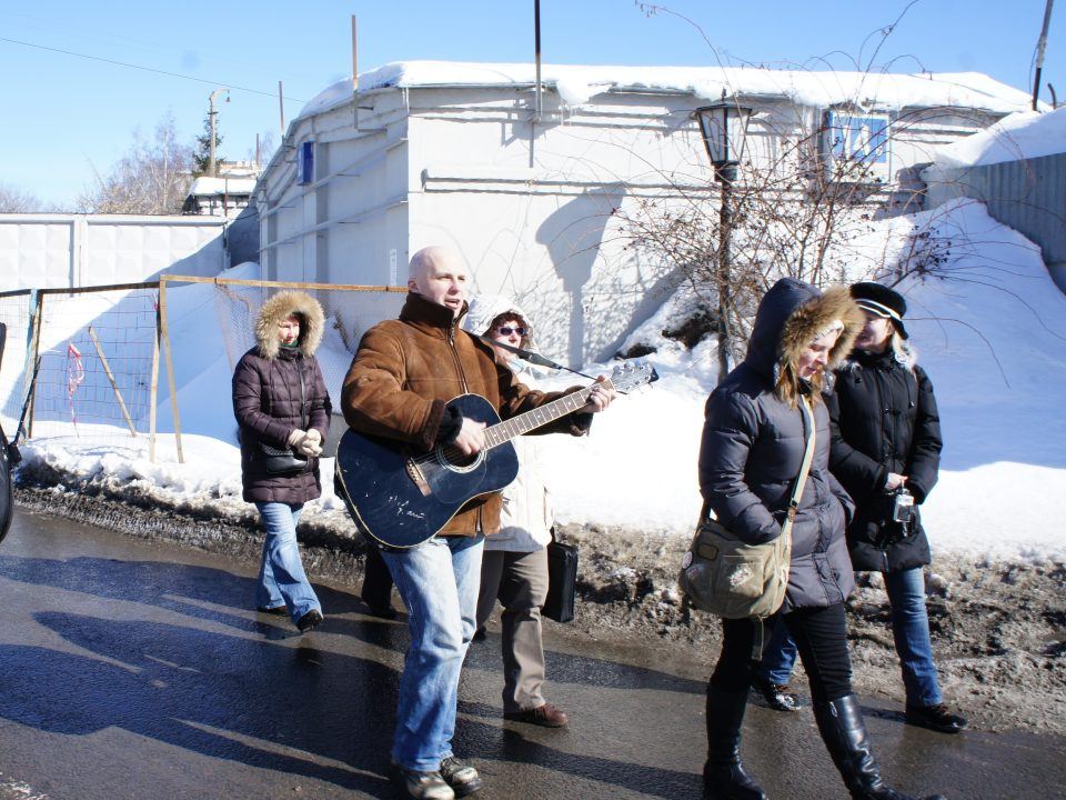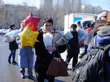 Активисты пели песни и играли на гитаре. Многие пришли с белыми лентами, почти все с подарками: мягкими игрушками, цветами и открытками.