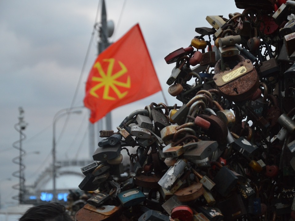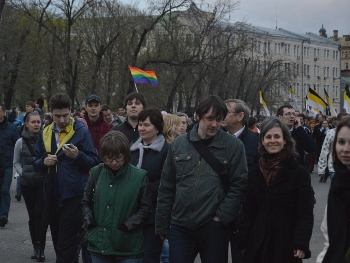 Но эту просьбу проигнорировали националисты, их трехцветные флаги продолжали развиваться в небе. Позже свою атрибутику подняли "яблочники", активисты из ЛГБТ-движения, РСД и анархисты. Активисты из движения "Партизанинг" вдали над толпой подняли собственный политический "атрибут" — надувную блестящую конструкцию, похожую на фаллос.