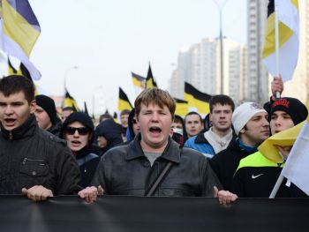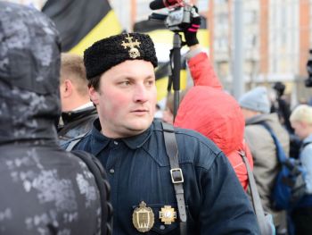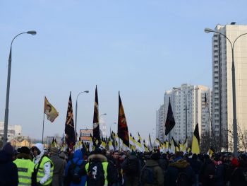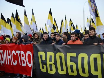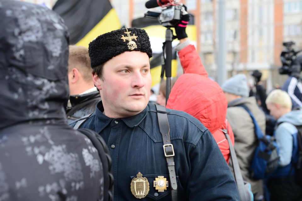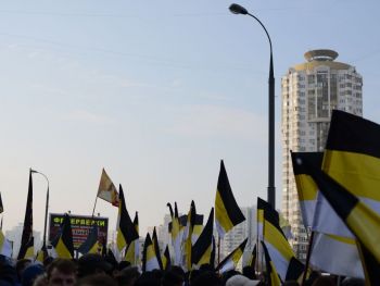 Перед шествием в самом начале колонн развернули огромное имперское полотнище. Сейчас колонны должны двинуться. Но происходит какая-то заминка. Лидер объединения "Русские" Дмитрий Демушкин с грустью сообщает журналистам, что в этот раз на акцию пришло значительно меньше людей (чуть больше 2 тысяч) и поясняет, что это произошло из-за украинской темы. Потом он рассказывает, что последние две недели на организаторов "Русского марша" власти оказывали давление и ему пришлось выйти из их рядов. Кроме этого, столичные власти отказали в проведении митинга и концерта после окончания марша.