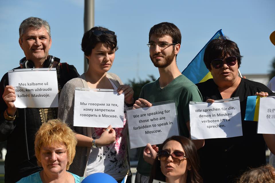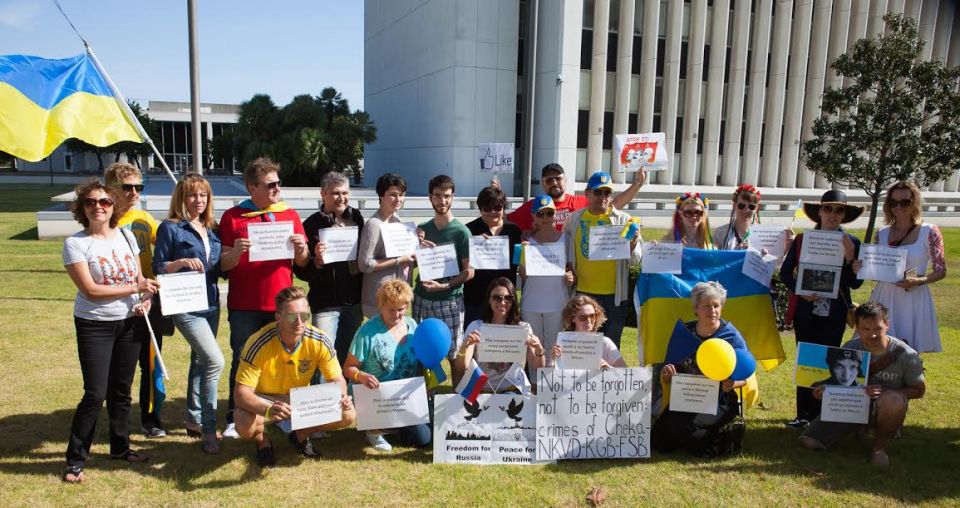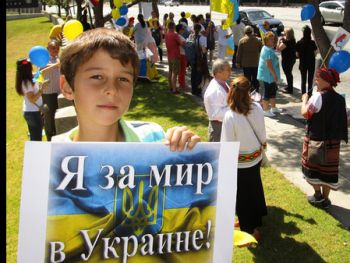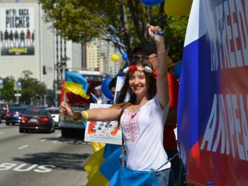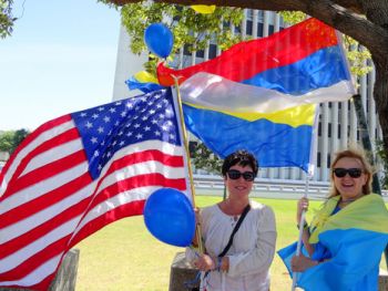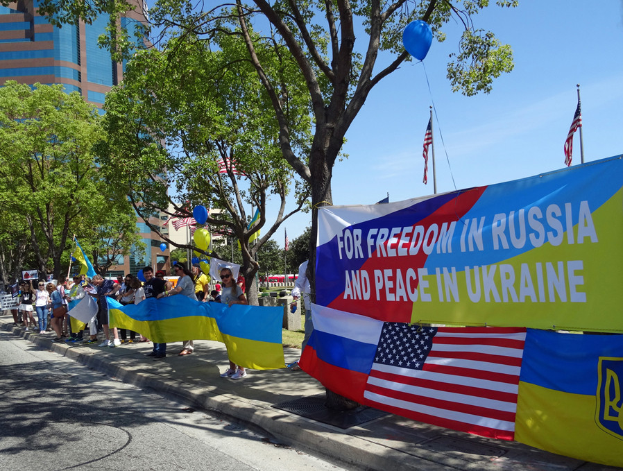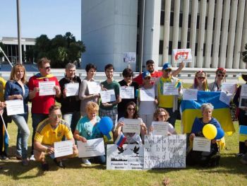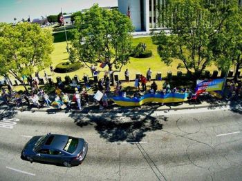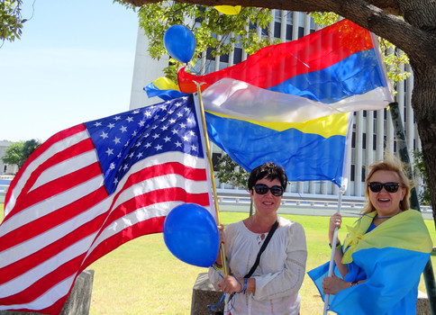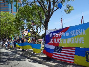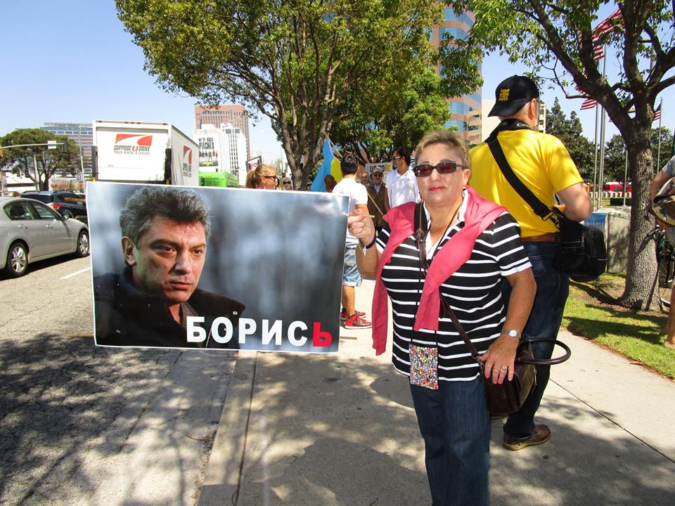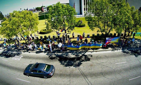 19 апреля в Лос-Анджелесе состоялся "Марш Мира и Свободы". Это уже второй марш за последнее время, который объединяет американцев, преимущественно эмигрантов из России и Украины, на одном митинге с очень похожими требованиями и лозунгами. На этот раз акция в Лос-Анджелесе и во многих других городах мира проводилась в поддержку "Марша Мира и Свободы" в Москве, который был отменен, но тем не менее москвичи вышли на улицы столицы с одиночными пикетами. В связи с этим собравшиеся на марше в Лос-Анджелесе держали плакаты на всех языках мира со словами "Мы вышли за тех, кому запретили говорить в Москве" в знак солидарности с активистами и просто неравнодушными людьми в России. Преимущественное большинство участников этого марша тем не менее составляли выходцы из Украины. Пришедшие на марш принесли самодельные плакаты, среди которых были портреты в память убитого Бориса Немцова, в поддержку Надежды Савченко и Олега Сенцова. Прозвучало очень много лозунгов против войны, Путина, в поддержку украинского народа в его борьбе за целостность своей страны и за мир. Собравшиеся также исполнили гимн Украины.