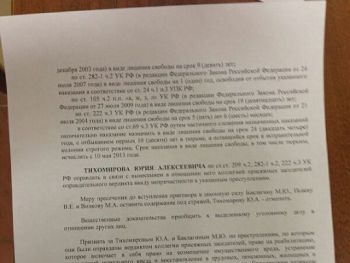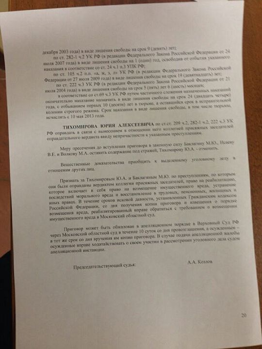 Четвертый обвиняемый Юрий Тихомиров полностью оправдан и, согласно приговору, имеет право на реабилитацию. Коллегия присяжных сочла, что он не причастен к инкриминируемым преступлениям.