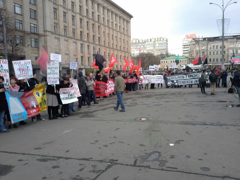 "За угнетенных против угнетателей!", "Сказки в телевизоре, реальность — в нищете в классовом неравенстве!", "Мир без границ!", "Мир, а не война, труд, а не порабощение, май для всех!",
