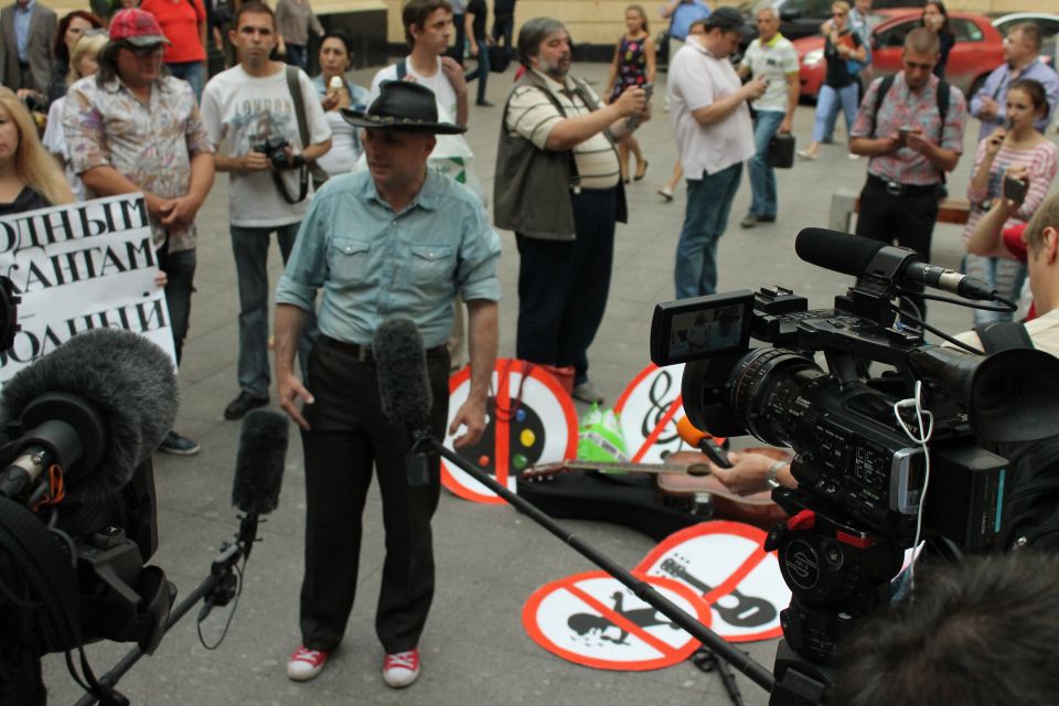 Участники акции напротив памятника Булату Окуджаве, где выступили музыканты, поэты и другие артисты, повесили на фонарный столб стилизованный знак с перечеркнутым скрипичным знаком. Поддержать активистов пришел лидер "Яблока" Сергей Митрохин.