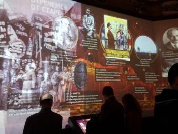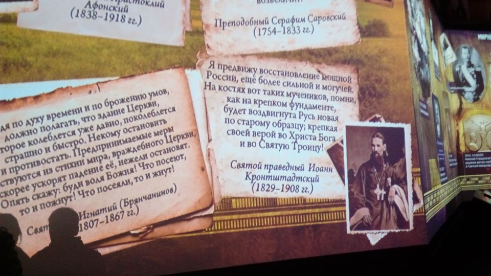 Магистральным идеям выставки организаторы подчиняют отобранные цитаты, интерпретации, факты и мифы, умалчивая о не вписывающихся в концепцию событиях. Не дают они и ответа на вопросы, которые сами собой возникают из предложенной концепции — каким образом уничтожившие великую страну красные "бесы" построили империю, которая подана как равная своей предшественнице. И как в этой новой "великой" стране могло происходить то, что происходило. "Этих священников замучили в тюрьмах", — показывает молодая мать своему семи-восьмилетнему сыну один из стендов. "Почему?" — с ужасом и недоумением восклицает ребенок. Прежде чем ответить, мама долго думает и, кажется, так и не находит нужных слов. Нет их, по всей видимости, и у организаторов выставки. И это не казалось бы странным, если бы другие исторические задачи они не решали бы с такой легкостью.