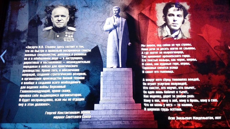 Впрочем, в трактовке авторов есть в российской истории и одна фигура с неопределенным знаком — Иосиф Сталин. Посвященный ему стенд разделен на две части. На каждой сменяют друг друга цитаты политиков, историков, философов, деятелей искусства. Те, что слева, говорят о его достоинствах как вождя и военачальника, те, что справа — о его преступлениях. Упоминаются и репрессии той эпохи, но только в отношении духовенства. Несколько залов посвящены новомученикам — погибшим в лагерях священникам. В одном из них, пожалуй, самый интересный экспонат выставки — атрибуты культа, которые священники использовали при тайных богослужениях в лагерях. Рядом с ними не менее сильный стенд — письма солдат Второй мировой войны своим матерям.
