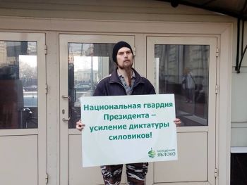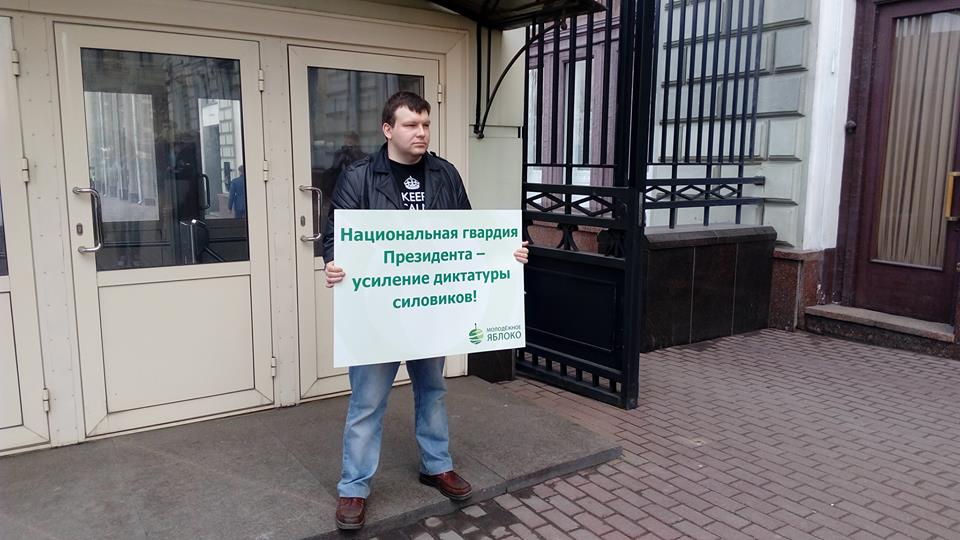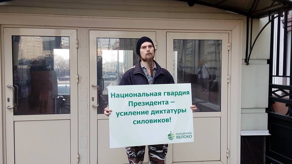 Активисты московского "Молодежного "Яблока" 8 апреля провели серию одиночных пикетов против создания Национальной гвардии. Акция прошла у здания приемной президента России. Об этом сообщает корреспондент Каспаров.Ru.