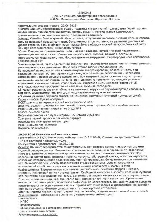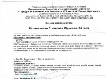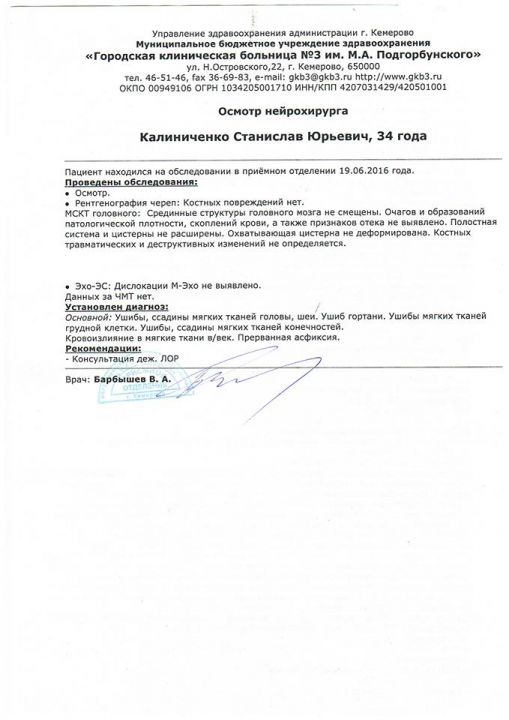 По настоянию матери и брата мне вызвали скорую. Скорая настояла на том, чтобы меня отвезли в Городскую клиническую больницу №3. Там зафиксировали побои. Врач приемного отделения больницы потребовал отправить меня в Кемеровский Областной Клинический Госпиталь для Ветеранов Войн к дежурному отоларингологу на дополнительный осмотр. Однако, приехавшие со мной сотрудники полиции под командованием следователя из СК Руслана Шалимова решили иначе и насильно вернули меня в отдел полиции, нарушив мое право на получение медицинской помощи.