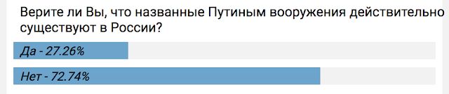 Еще до оглашения этого послания многие аналитики и комментаторы расценивали его как очевидную предвыборную акцию, нацеленную прежде всего на внутреннюю аудиторию. В этой связи интересен опрос, буквально на следующий день запущенный на сайте newsru.com: с некоторыми оговорками он позволяет увидеть, что эта самая аудитория думает про нашумевшую речь вошьдя. Оговорки следующие: данный портал – часть того, что осталось у Владимира Гусинского после разгрома группы "Медиа-Мост"; долгое время основу аудитории этого интернет-издания составляли люди, оппозиционные режиму серых гебешничков. В то же время, офис издания находится в Москве – и с некоторых пор в редакционной политике портала наметился крен в сторону пресловутой геббельсовской формулы "70/30": была закрыта украинская редакция, часть материалов засмердела имперско-фашистским душком – и сегодня русская редакция этого сайта вполне себе ватненькая, в точности, как некогда принципиальное "Эхо Москвы". Соответствующим образом меняется и аудитория портала: адекватные и здравомыслящие читатели посещают его реже, зато доля биомассы с лишней хромосомой вместо мозга заметно выросла (на страницах издания в социальных сетях это видно вполне отчетливо).