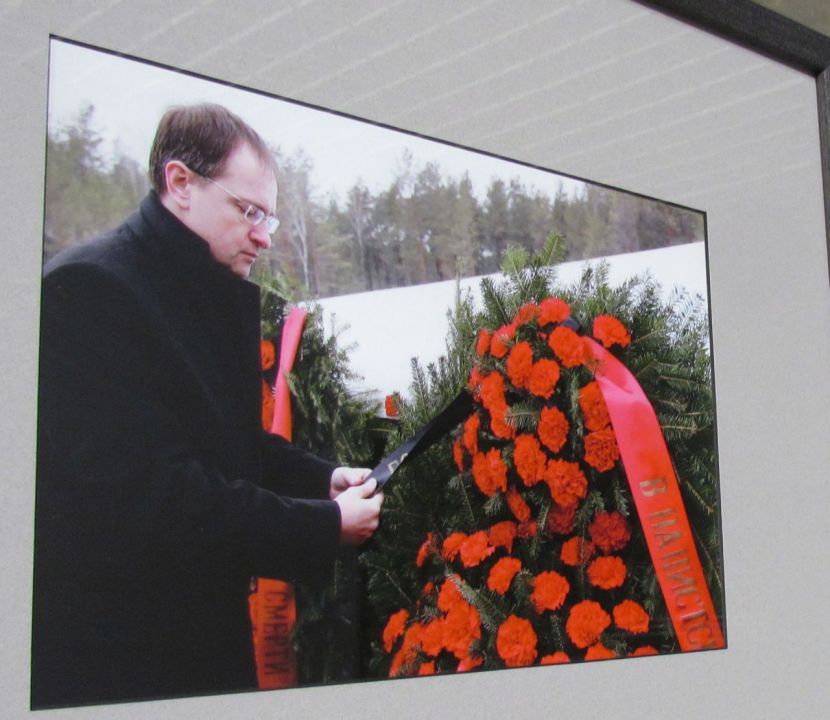 Второе. Отремонтированный вход. По коричневому металлу, в стилистике созданного польскими архитекторами мемориала убиенных польских граждан две стены, образующие вход. На них на русском и английском языках надпись "Здесь захоронено более 8000 советских людей и более 4000 польских граждан". Надпись вписана в мартиролог имен — два русских имени чередуются одним польским, всё в предложенной цифровой пропорции. Всё верно? И да, и нет. Для пояснения забегу чуть вперед в выставочный зал. На одной из стен 58 портретов советских людей, нашедших вечный покой в этом лесу в результате короткой, но емкой надписи — "расстрелян, 58". Может быть, это напоминание о той самой всесильной и всех уничтожавшей 58-й статье советского кодекса? Итак, из общего предъявленного мартиролога только под 31 портретом надпись "русский", при этом у некоторых "русских" совсем не русские фамилии, имена, отчества. Такова была "добрая" советская система, что, учитывая наличие 5 графы в паспорте, многие стремились записать там титульную нацию страны. Страшно это? В принципе, не очень. Вопрос только в том, что заставляло людей это делать! Кто остальные 27? В основном поляки, а также латыши, евреи, литовцы, есть и совсем диковинка — хорват, француз!