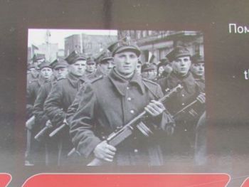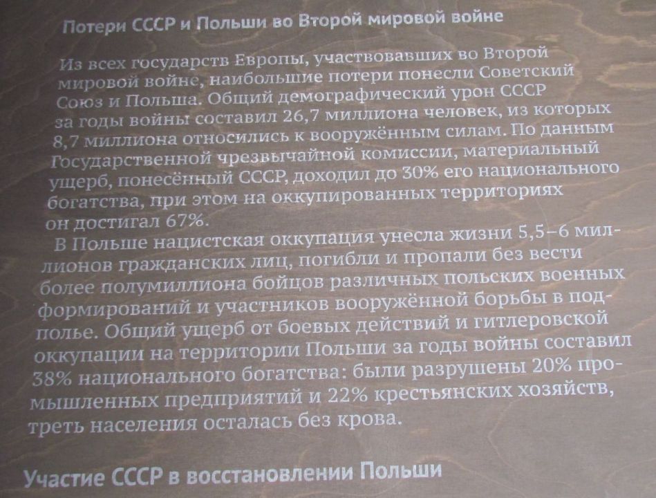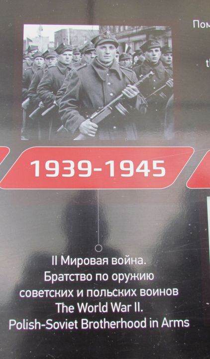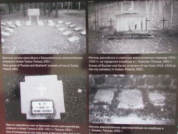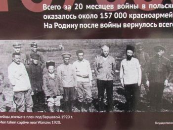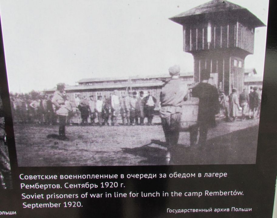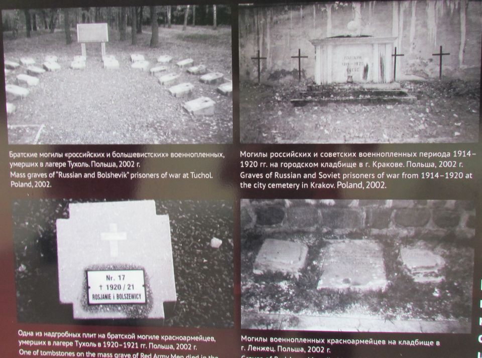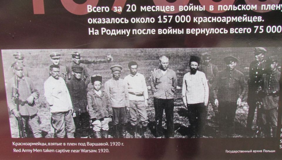 К сожалению, всё ещё находятся "специалисты", мечтающие о государственной границе России, проходящей где-то в районе Сосновца. Да, на дворе XXI век, но большая часть общества, в том числе и облеченная той или иной властью, мечтает о позапрошлом веке. Как следствие — знаменитую фразу из фильма "Александр Невский" С. Эйзенштейна "Кто к нам с мечом придёт..." относит только к противоположной стороне, на себя обратиться ни желания, ни воли не хватает. Судьба красноармейцев трагична, но вина за их смерть лежит не только на холоде и голоде, естественно обрушившихся на пленных заключенных в лагерях, местному населению тоже приходилось переживать последствия военных действий. Кстати, в Советской Республике в это время тоже был голод, и в ряде регионов массово умирали невинные гражданские люди. Вина лежит и на тех, кто, грезя мировой революцией, послал их умирать за эти идеалы, абсолютно противоречащие Декрету о мире. Но с точки зрения военно-истерического общества такой вины в принципе быть не может. Они знают только одну позицию "Наше дело правое? (ЛЕВОЕ!) победа будет за нами". На соседних фотографиях военнопленные, стоящие в очереди за получением обеда, и фотографии разрушенных памятников воинам на польской земле. Ни слова об обустройстве, в том числе и могил этих красноармейцев, сделанном польским государством в 2000 годах. Изданию "Могилы и кладбища русских и советских солдат с XIX и XX века в Польше", изданному на русском, польском и английском языках с массой цифр, фактов и фотографий в 2016 году, — в экспозиции места нет. Для интересующихся замечу — по данным этого издания, последний памятник над могилами погибших был воздвигнут и открыт с отданием всех военных почестей в 2015 году. На поддержание мемориальных кладбищ польское государство выделяет средства. С 2001 по 2015 год всего 13.539.069.00 злотых (более 300 млн евро)! Интересующиеся могут полюбопытствовать российскими цифрами и сравнить их.