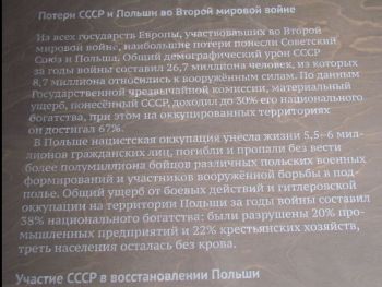 Третье. Польская экспозиция занимает такое же скромное пространство, как и прежде, когда в России после распада СССР был впервые создан и открыт Катынский мемориал. Событиям, произошедшим в 2010 году во время подлёта к Смоленску польской делегации из 96 человек во главе с Президентом Л. Качиньским, летевших на памятную церемонию, приуроченную к 60-летию начала расстрелов, — ни места, ни слова не нашлось. Оставлю это без дополнительного комментария. Думаю, читателю и так всё ясно.
