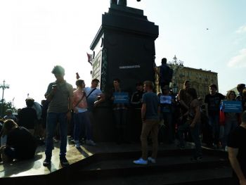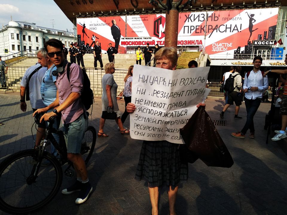 Они мирно тусовались возле памятника Пушкина и "Известий", держали в руках плакаты, выкрикивали лозунги с призывами к Путину уйти в отставку и вернуть украденные пенсии.