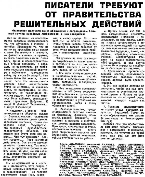 [1] Писатели требуют от правительства решительных действий // Известия. 1993. № 189 (24044). 5 октября.