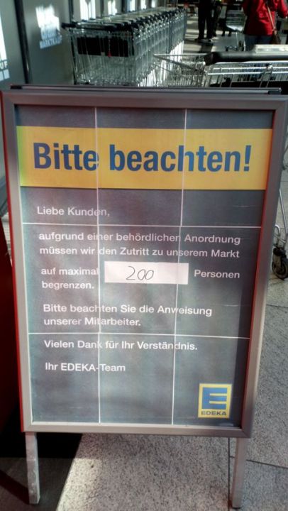 Вот объявление, что вход в магазин ограничен двумястами покупателями.