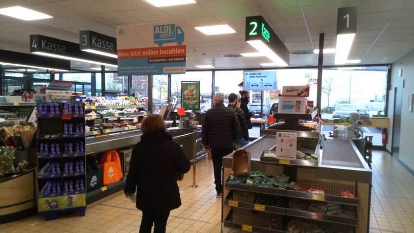 Вот фото, сделанное в субботу, 21 марта, в первый день действия новых правил, в магазине Aldi. Обычно в субботу с утра и днем магазин полон — работающие закупаются на следующую неделю — функционируют все пять касс, но, как видите, в этот раз магазин даже не полупустой, а почти пустой.