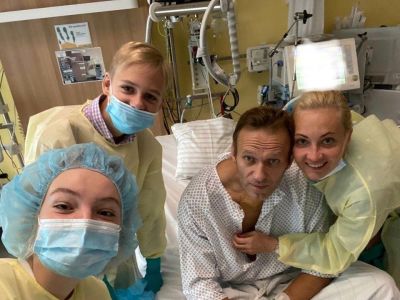 К посту прилагается фото оппозиционера в окружении родственников в немецкой клинике.
