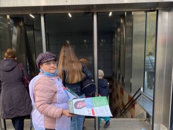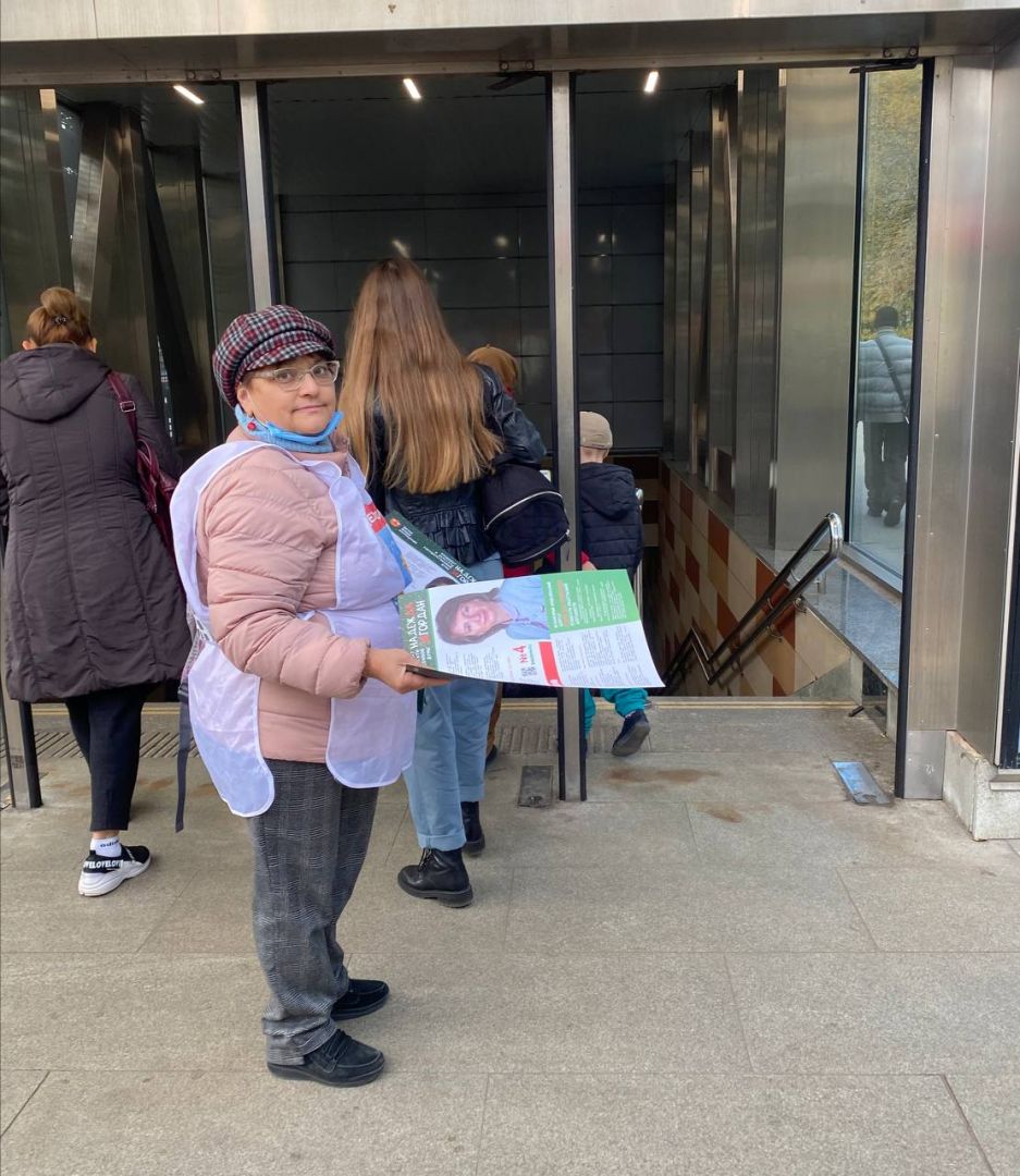 Наткнулись мы на него довольно быстро — он стоял у другого входа в метро. Девушка, раздававшая листовки, рассказала, что тоже агитирует по любви. Она давно следит за деятельностью Поповой и, когда узнала, что та идет в Госдуму, решила ее поддержать. Сказала, что волонтёрила бы и так, но подзаработать тоже хорошо.