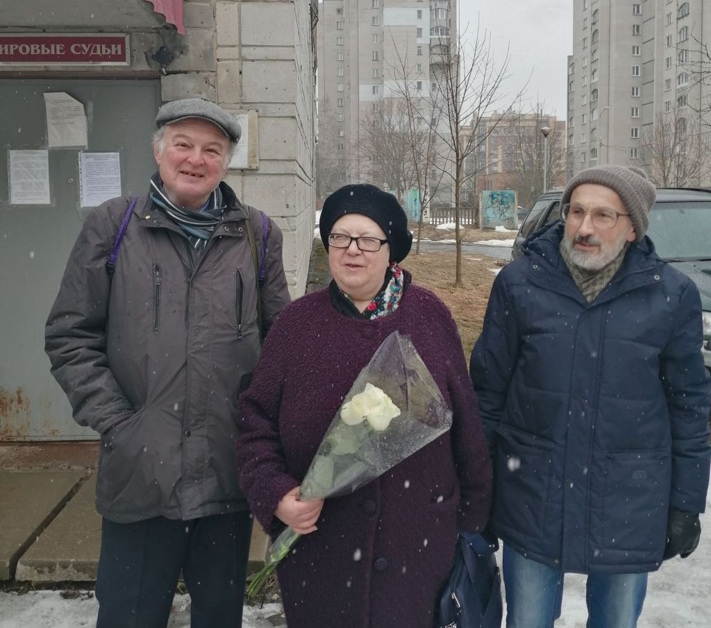 Фотография Татьяны Котляр вместе с пришедшими к зданию суда и допущенными судьей в зал заседания друзьями и знакомыми Татьяны Котляр — жителем Обнинска Львом Ингелем и москвичом Юрием Самодуровым.