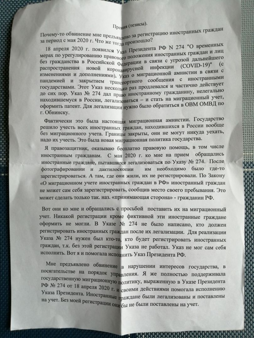 "18.04.20 вышел указ президента РФ №276 о временных мерах по регистрации мигрантов и беженцев — фактически это указ о миграционной амнистии. С мая 20-го года этот указ в Обнинске стал использоваться. Я помогала исполнению указа президента №276 и с мая 2020 года бесплатно прописала в своей квартире 46 человек мигрантов, поскольку никакой регистрации кроме регистрации посредством прописки у меня в квартире они получить <во исполнение указа президента> не могли".