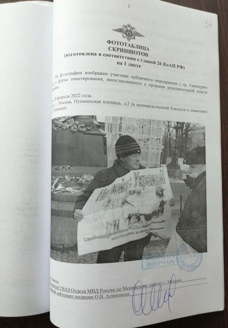 В деле по обвинению меня в участии в этом пикете, которое вчера рассмотрела судья Смирнова, на 36-м листе приведена фотография человека с плакатом "НЕТ ВОЙНЕ С УКРАИНОЙ!" и с подписью, что это Самодуров Ю.В. Лист с фотографией заверен двумя печатями и подписью ст. лейтенант Алимпиева.