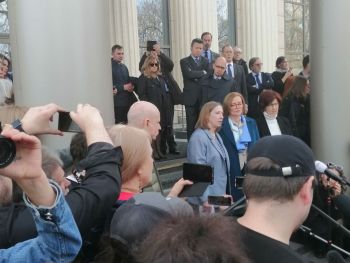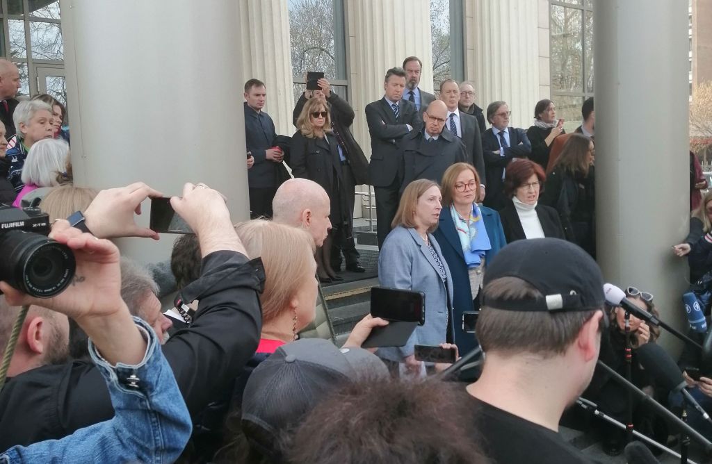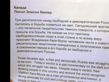 После оглашения приговора Владимиру Кара-Мурзе при выходе из здания Мосгорсуда на его ступенях выступили три человека — три женщины (послы) и один мужчина из толпы слушателей. Послы Канады, США, Великобритании выступили очень достойно и здорово! Послы Канады и США прочитали в микрофон заявления, несколько десятков экземпляров которых после этого были розданы публике. Эти заявления я сфотографировал и прилагаю.