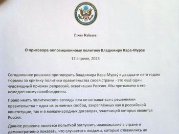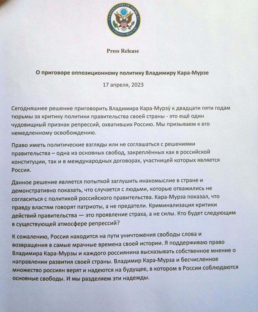 Краткий текст заявления посла Канады, в котором сказано о повороте нашей страны к ее страшному прошлому, которое знаменует сегодняшний приговор Кара-Мурзе к 25 годам лишения свободы вполне выражает и мои чувства и мысли. Посол Великобритании потребовала освободить Кара-Мурзу.
